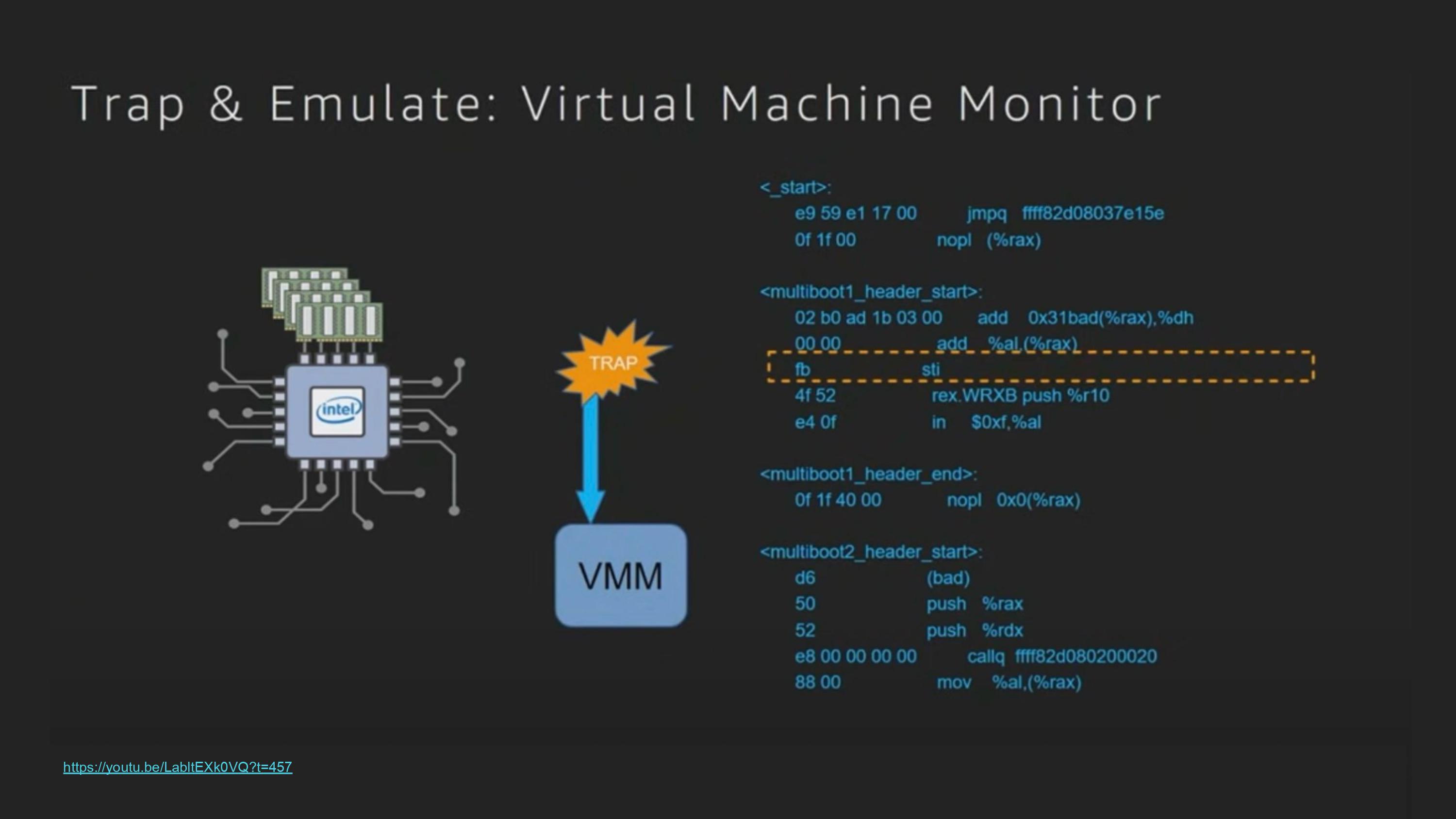 sti 같은 instruction을 unprivileged mode에서 실행한다면 error를 발생시키고 이 instruction을 VMM(Virtual Machine Monitor)에게 전달.