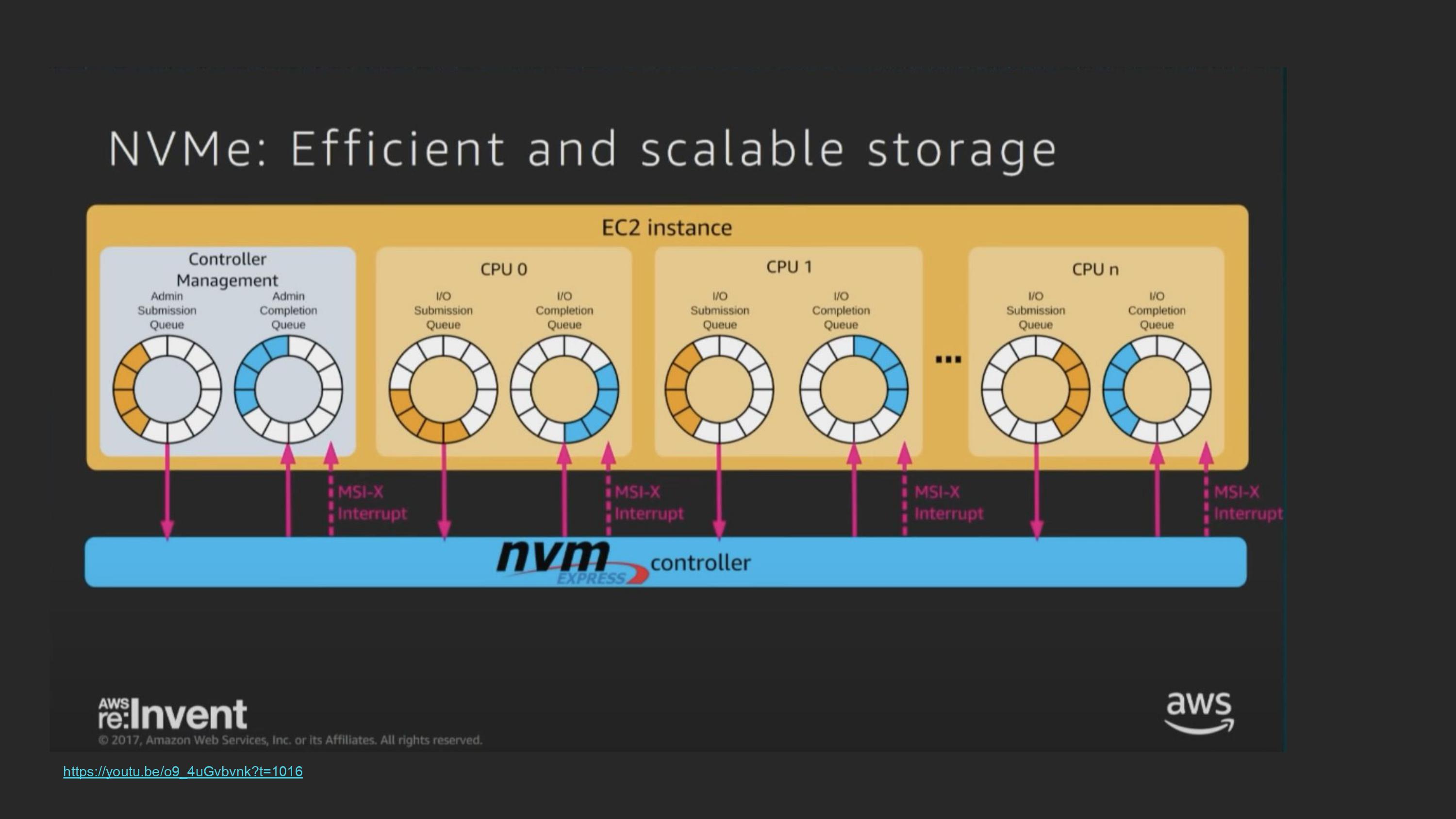 NVMe는 PCIe에서 ssd를 연결하기 위해 만들어짐. 따라서 EBS offloading이 가능. cpu마다 dedicated submission/completion queue가 있어 각 cpu가 io를 직접할수있음
