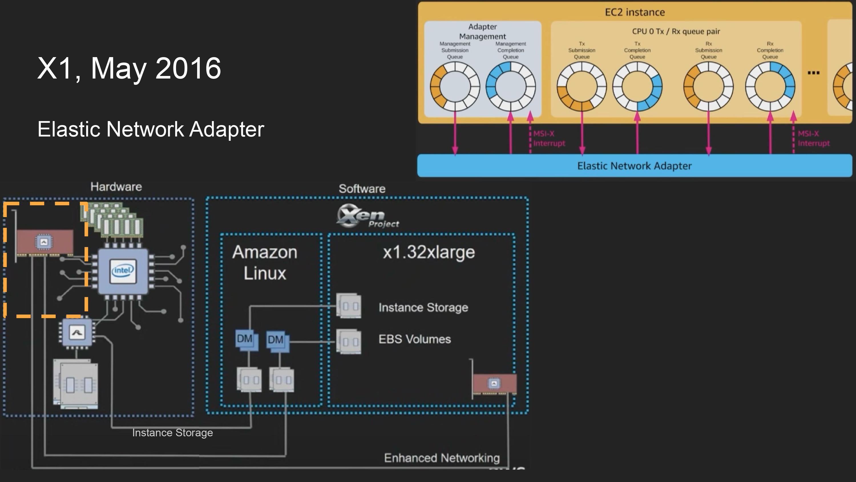 하지만 SR-IOV(Single Root IO Virtualization)를 지원하는 card는 없었는데, 이는 PCIe device를 가상으로 노출시켜주는 기능임. network card를 한개 꽂고 멀리 있는 storage를 EBS로 노출시킨다거나 하는데 필요함