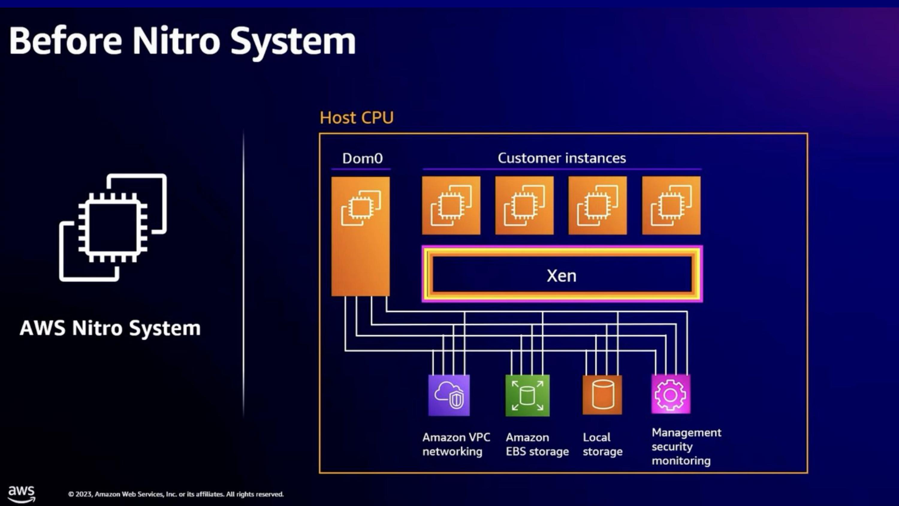 또한 device와 통신하기 위해서 존재하던 dom0가 제거되며, Xen Hypervisor도 오로지 VMM 역할만 하는 Nitro Hypervisor로 변경됨